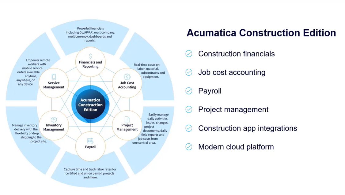 Many platforms handle project management but fail at accounting. Acumatica integrates project accounting with core financials (job costing, payroll, AP/AR).